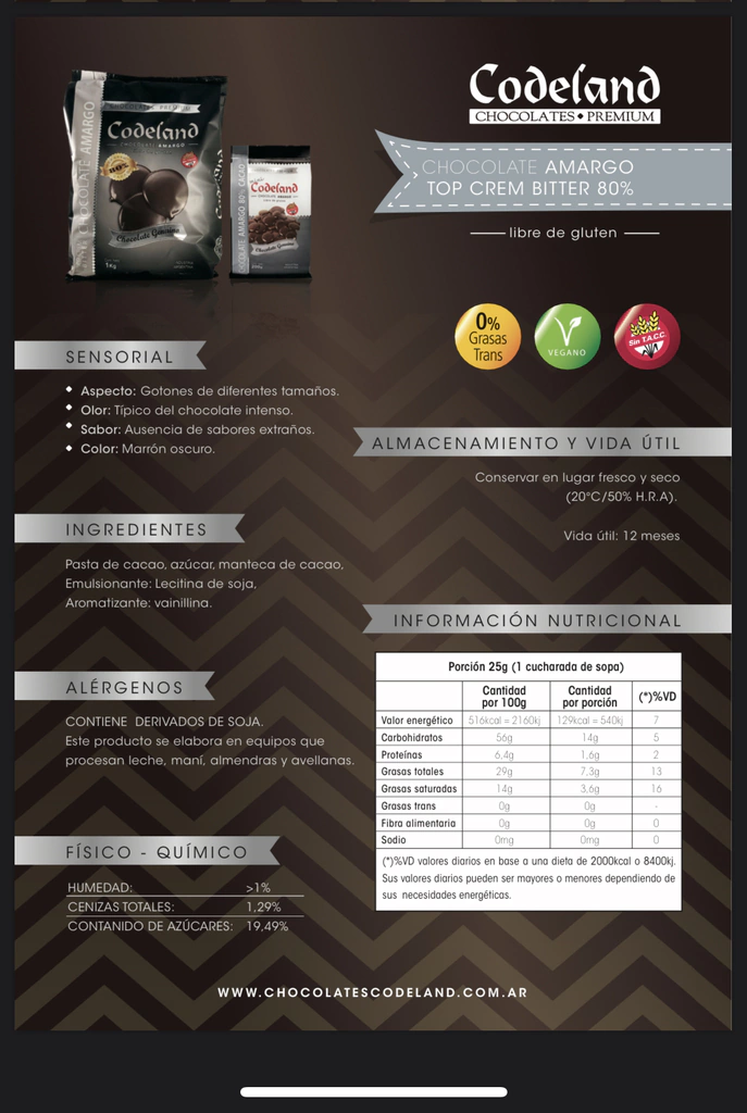 Chocolate Amargo 80 % Codeland SIN TACC x 1 KG CodelandShop