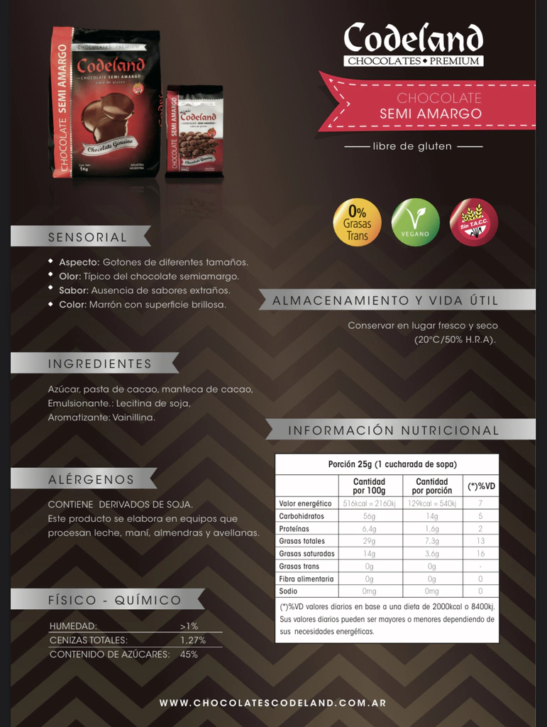 Chocolate Semi Amargo SIN AZÚCAR Codeland SIN TACC x 1 KG CodelandShop
